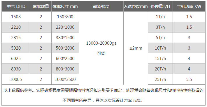 DHD型對輥干式磁選機是我公司經多年市場經驗研發的一種新型干選設備。其磁系經過特殊設計、屬于永磁局部半閉合磁系結構;磁感應強度大并且可在13000GS~20000GS范圍內進行調節。將物料均勻的送到磁選區域后,在設備的磁選區受到重力和磁場力的作用下,利用物料的磁性差異有不同的運動軌跡實現分離,磁性礦物被吸附在磁輥表面旋轉到達精礦區,毛刷將吸附在磁輥表面上的磁性礦刷脫。該機對粉礦率較少但又均勻的中小顆粒狀礦石分選效果卓越,生產效率高,操作簡單方便。適用于硅粉、石英石、鋯石、長石等細粒級的非磁性礦石去除磁性物提純作業。